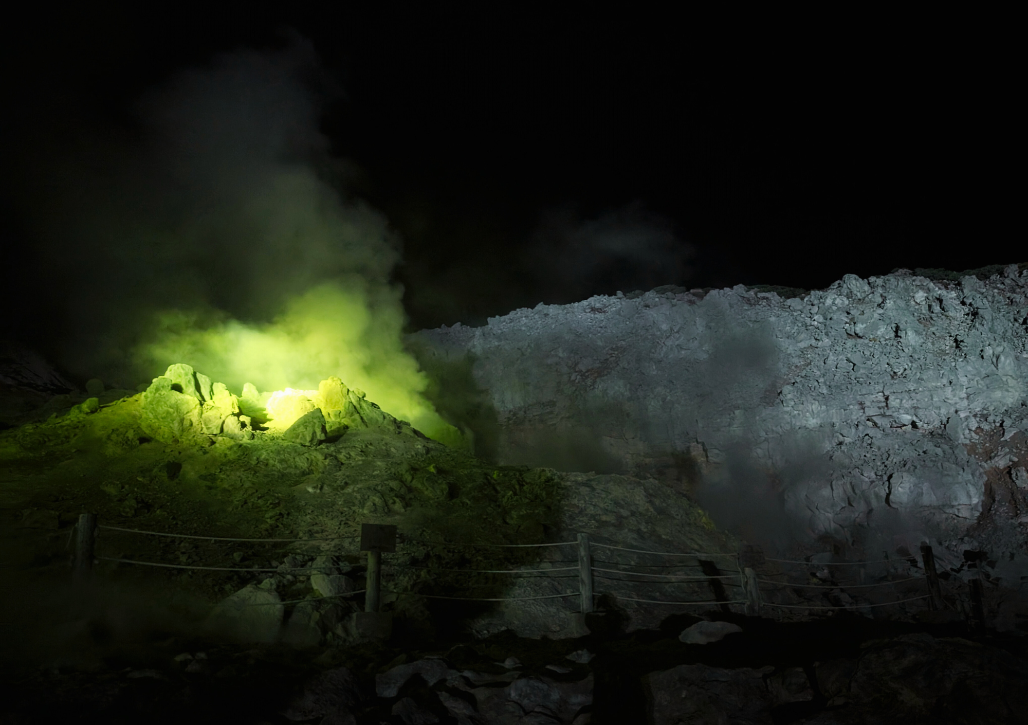 日中は白い噴煙を上げるダイナミックな姿で知られる硫黄山が、ライトアップの時間帯には静寂と光に包まれ、全く異なる神秘的な表情を見せます。