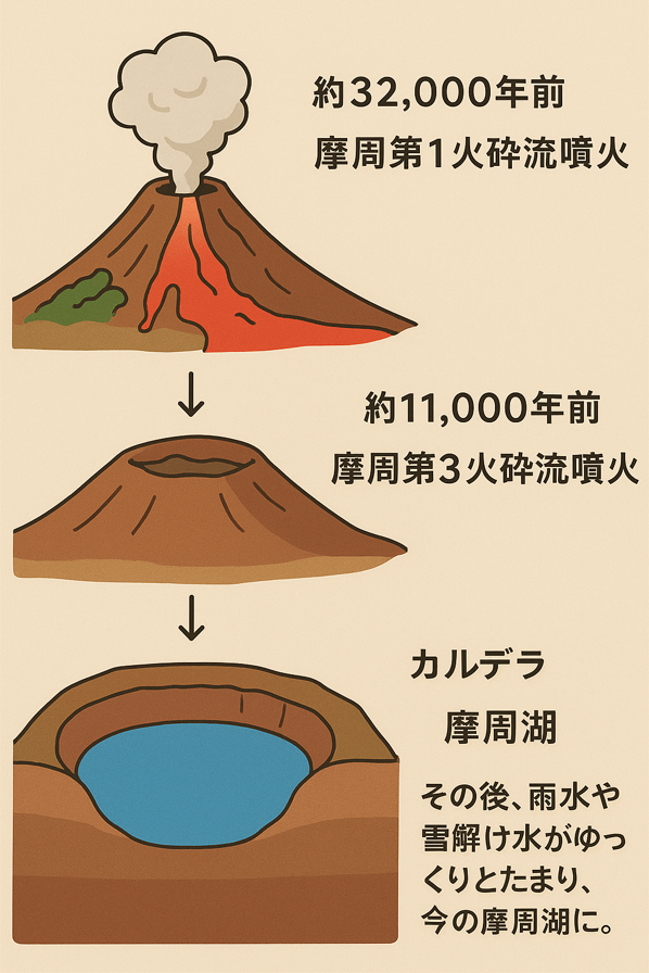 → 現在のカルデラの形が確立。 - その後、雨水や雪解け水がゆっくりとたまり、今の摩周湖に。